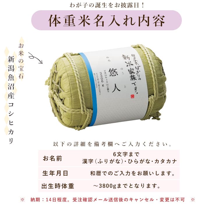 内容魚沼産コシヒカリ(出生時体重 3800gまで)※出生時体重と同じ容量には俵容器の重さは含まれておりません。